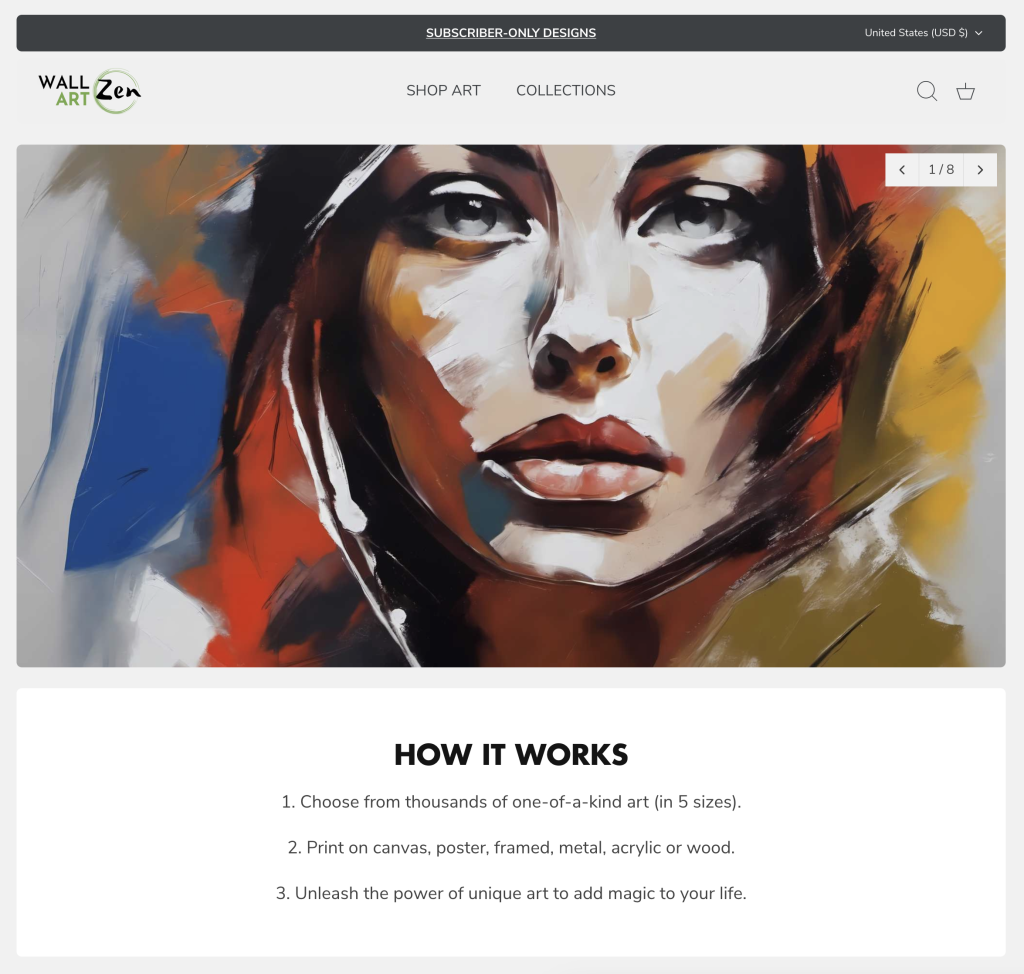 WallArtZEN is a cutting-edge online marketplace for extraordinary wall art. Here, innovation meets creativity, featuring a curated selection of groundbreaking designs. Embrace the future of art with WallArtZEN, where every piece reflects a fusion of artistic evolution and state-of-the-art technology, crafted for those who seek to inspire their spaces with unique art. Transform your environment today by saying no to buying boring art.